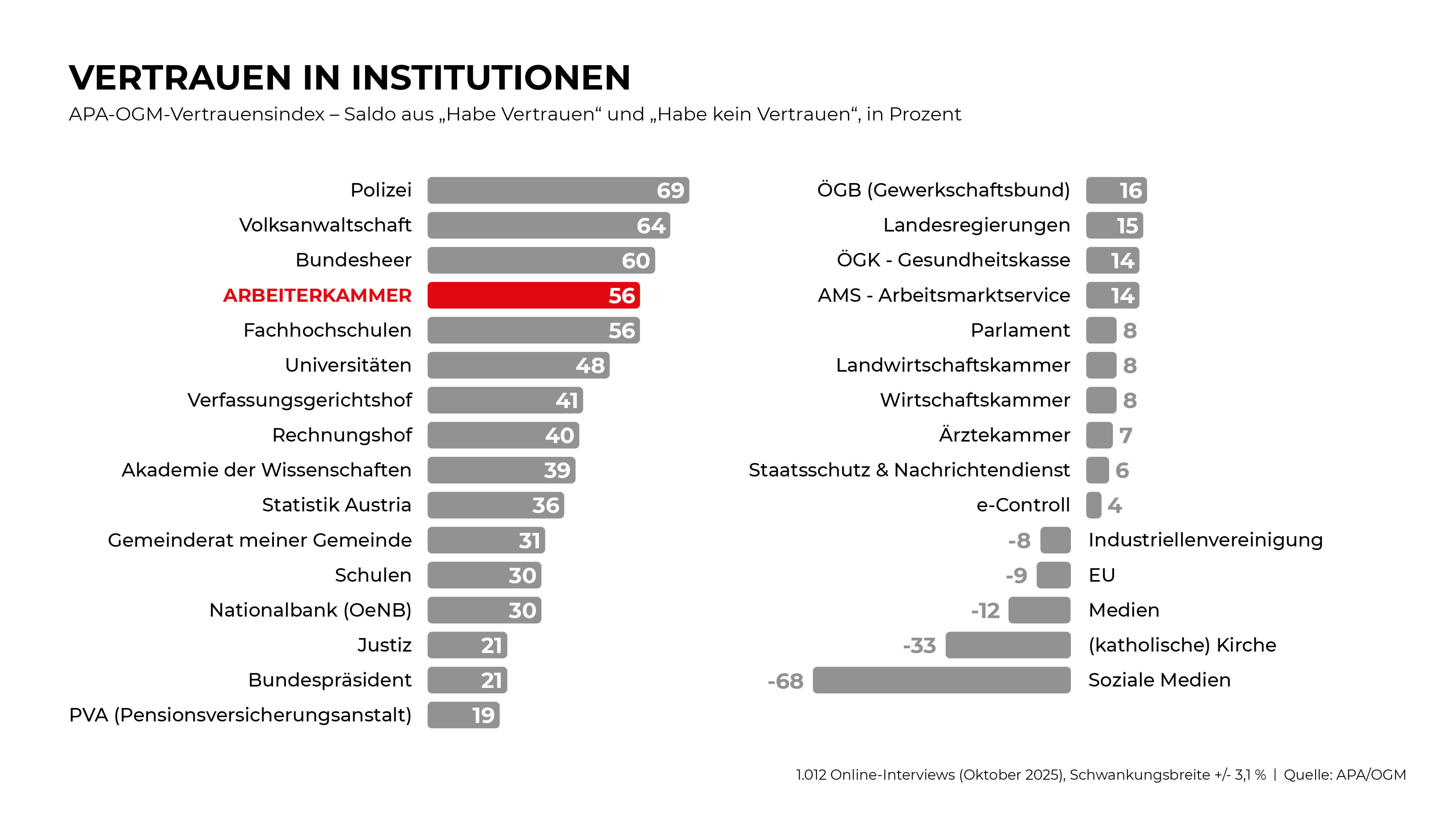 Welchen Institutionen vertraut die Bevölkerung? Das misst der APA-OGM Vertrauensindex. Das aktuelle Ergebnis zeigt einmal mehr, wie beliebt die Arbeiterkammer ist. Mit einem Vertrauenswert von 56 erreicht die Arbeiterkammer ihr historisch zweitbestes Ergebnis in der Gesamtbevölkerung.